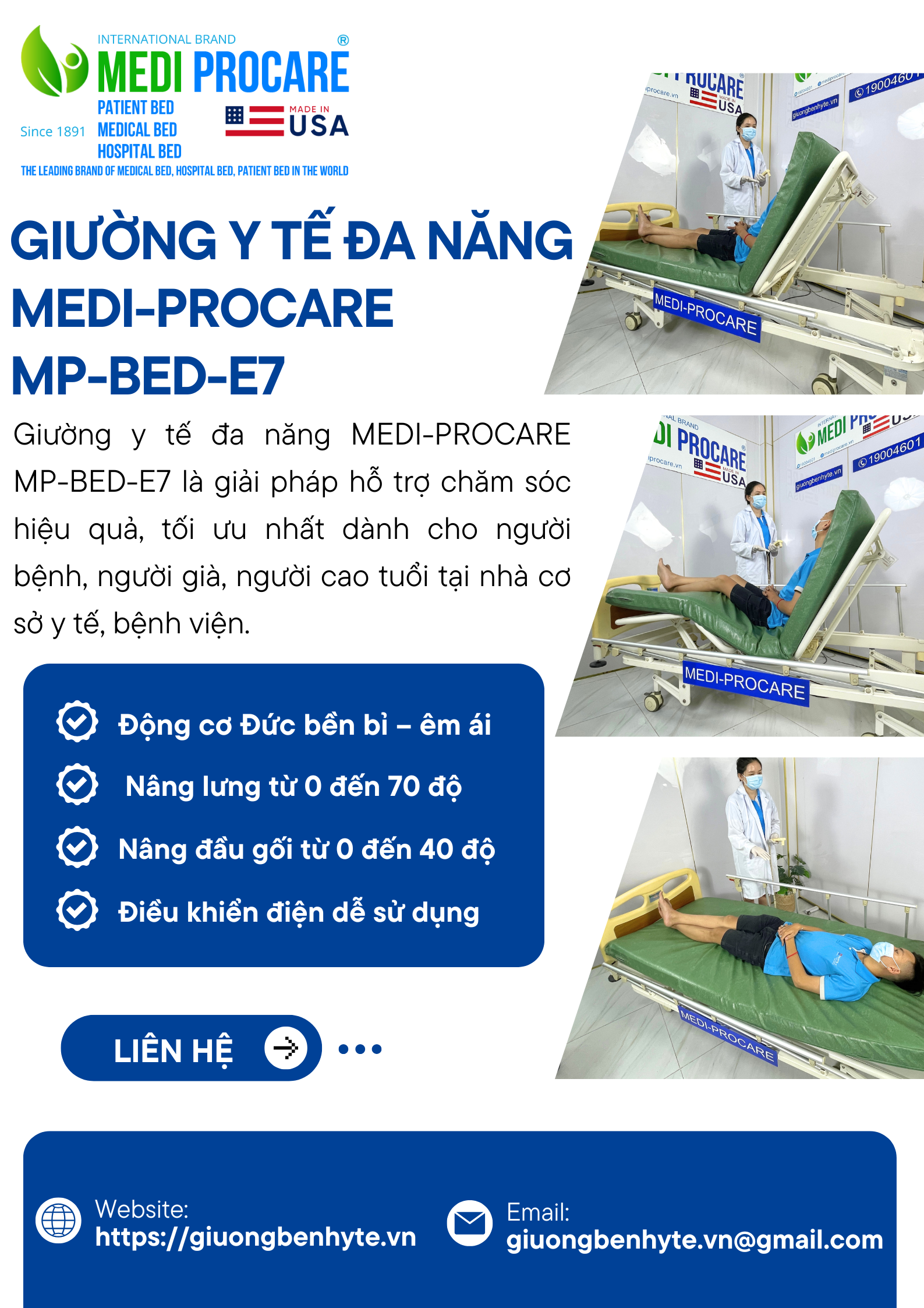 Giường y tế MEDI-PROCARE MP-BED-E7 là dòng giường bệnh nhân điều khiển điện đa năng thế hệ mới, được thiết kế chuyên biệt cho nhu cầu chăm sóc người già, người bệnh, người sau phẫu thuật tại nhà và cơ sở y tế.