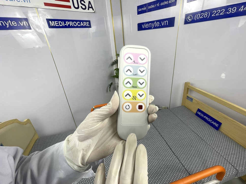Remote điện tử hiện đại giúp điều chỉnh toàn bộ giường từ xa: nâng đầu, nâng chân, xoay giường, điều chỉnh chiều cao và cài đặt tư thế khẩn cấp, tăng tính tự chủ cho người bệnh, đặc biệt trong môi trường gia đình.